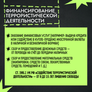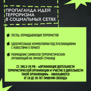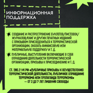 Формы и виды террористических преступлений, а также ответственность за совершение преступлений террористической направленности, предусмотренная Уголовным Кодексом РФ — в карточках, разработанных медиацентром Калужского коммунально-строительного техникума им. И.К. Ципулина совместно с министерством образования и науки региона.